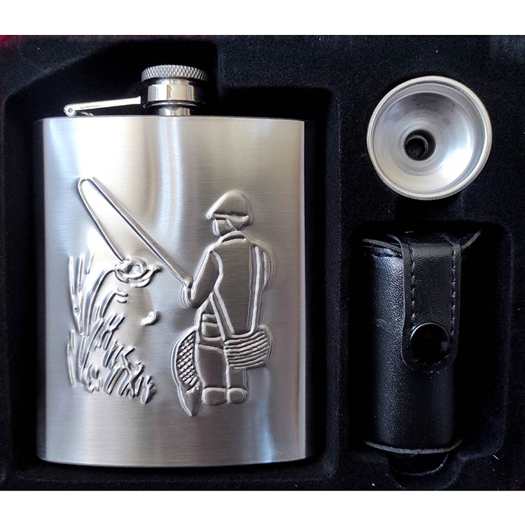 Подарочный набор "Рыбаку" - это идеальный подарок для любителей рыбалки. В комплект входит фляга на 255 мл и 4 рюмки, изготовленные из прочной и долговечной нержавеющей стали. В набор также входит лейка, которая обеспечивает легкое наливание жидкости в флягу или рюмки.