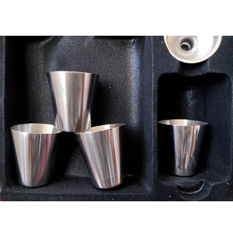 В комплект входит фляга на 7 унций (255 мл), 4 рюмки и удобная лейка, которая не даст пролить ни капли напитка.