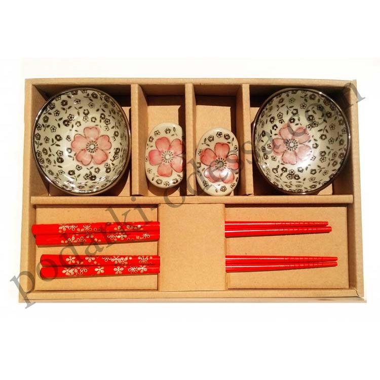 Набор для суши на два человека с цветком. Посуда сделана из керамики, палочки деревянные. Прекрасный подарок всем почитателям японской кухни.