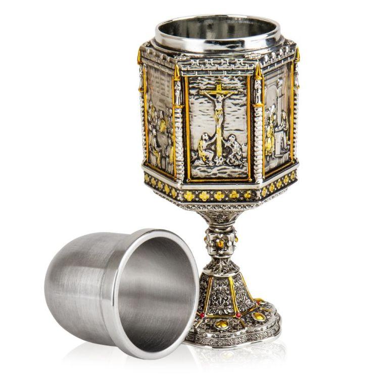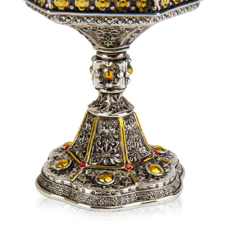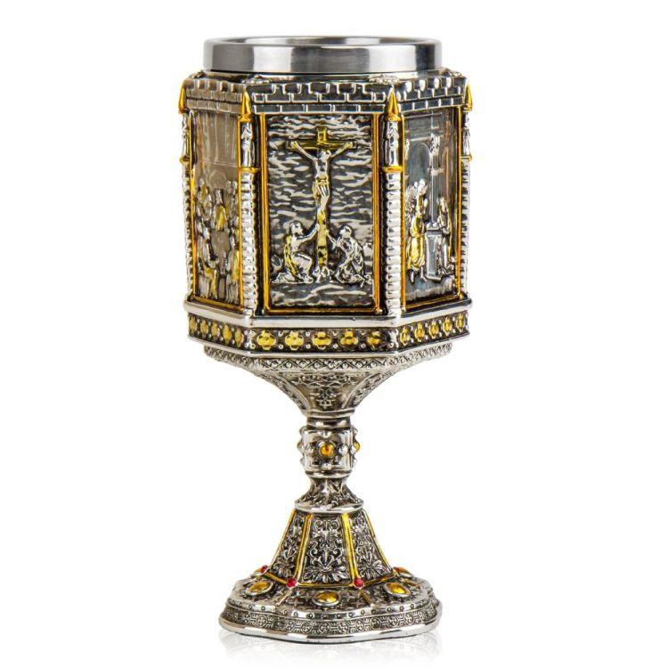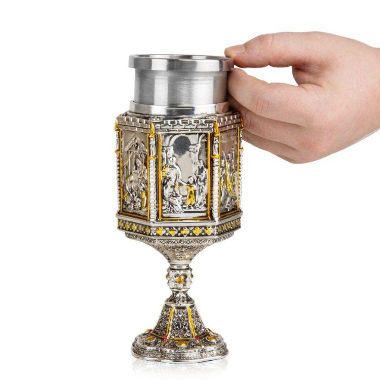 Кубок "Святое причастие" - изысканный подарок для верующего человека, руководителя, друга, важного человека, радующего каждый день своим мастерством. Достаточно раз посмотреть, насколько подробно проработаны все детали и насколько изысканно и дорого он выглядит. Кубок выполнен из полистоуна (искусственный камень), покрытый напылением из бронзы. Внутри Вас ждет не менее приятный сюрприз в виде съемной емкости из нержавеющего металла, которую удобно извлекать и аккуратно ополаскивать, при этом не травмируя и не подвергая никаким температурам сам кубок. Не предназначен для практического использования. Упакован в красивую подарочную коробку. Благодаря надежной внутренней упаковке, изготовленной из пенопласта с углублениями для мельчайших деталей, Вы можете быть уверены в безопасности при транспортировке. Высота кубка – 18,5 см, диаметр – 7,5 см. Объем – 200 мл.